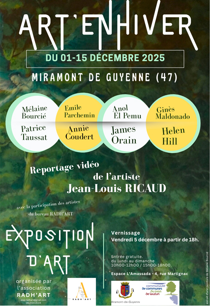 Je termine 2025 en participant à deux expositions collectives : - " Art En Hiver " à Miramont de Guyenne (47168, Lot et Garonne), salle Amassada, du 1er au 15 Décembre 2025, de 10h à 12h et 15h à 18h.