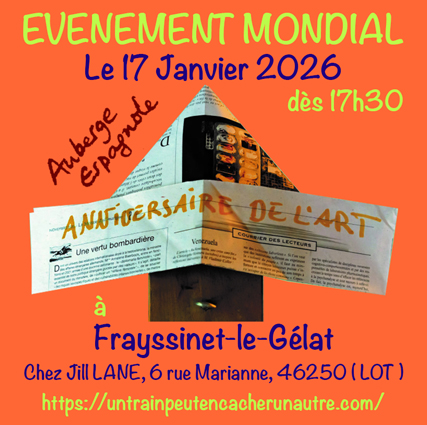 ![]() NOUVEAU : Les LAB-FABULEUX ! ![]() ▲ ![]() ▲ ![]() ▲ Sonia, pour la 3ème fois, nous invite pour un parcours festif d'art en campagne. Cette année, le thème retenu est "SACRÉ FILS". Pour en savoir plus, cliquez sur l'affiche. Et puis, si vous êtes artiste, ne tardez surtout pas à vous inscrire car le nombre de places reste limité. ![]() Le projet "ASSEZ !" n'a pas pu voir le jour l'an dernier, mais c'est un bon projet et nous tenons à le monter. Quelques moyens matériels et financiers sont réunis, reste à rassembler des oeuvres qui soient à la hauteur. Amis artistes, cliquez sur ce visuel pour en savoir plus, et postulez sans plus attendre ![]() En marge de l'Anniversaire de l'Art 2025, nos artistes ont égayé les rues de Cazals avec leur opération "Papiers de gouttières". cliquez sur l'image pour accéder au diaporama ![]() ![]() En cliquant ci-dessus, vous découvrirez la captation de l'anniversaire de l'art 2025, réalisée par Wlad. 2025, 1er rendez-vous dans le Train à 18h, le 17 janvier. Fêtons l'anniversaire de l’art. Venez avec votre attirail joyeux ou votre instrument ou en grande pompe avec des bulles, invitez vos amis. «L'Art ...un don éphémère : à l’espace, aux passants, à ce Je que Rimbaud avait dit être un autre. Une fois posé, ce qui est peint crée des liens. Des liens entres des motifs qui se répètent et s’entrelacent. Des liens entre les murs et les passants, entre les passants et l’auteur. C’est un acte marginal, en marge de la beauté. C’est populaire. C’est ordinaire. Ça ne délivre aucun message. Juste un peu de beauté. Ça ne fait qu’ouvrir les frontières qu’il y a partout çà et là entre les gens, entre l’art et le monde, entre l’art et l’ordinaire.» G.Cazeneuve devant l'oeuvre de R. Gray. Je vous souhaite une très bonne année 2025. Alexandra Merci de penser à renouveler ou prendre votre adhésion ou faites don si cela vous est possible dès ce début d’année qui, je nous le souhaite, sera joyeuse et créative. https://untrainpeutencacherunautre.com/adhesions.html ![]() Pour être publiés, répondons chacun à cette invitation. ![]() ![]() Il s'agit là des Pays de Loire. Qu'en sera-t-il en Occitanie ? Cliquez sur ce visuel pour découvrir nos intentions 2025