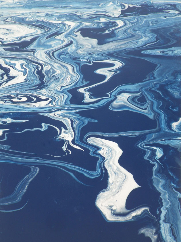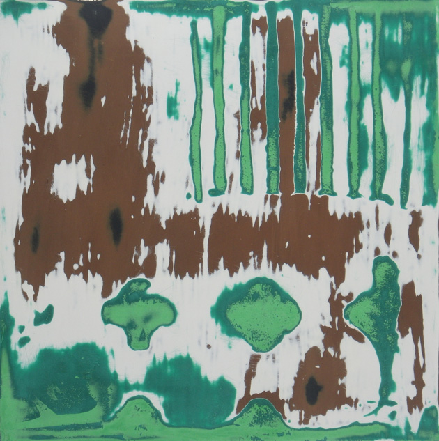 En jouant de quelques lois rhéologiques et en utilisant exclusivement des teintes initialement destinées à la décoration d'intérieur mais qui sont devenues indésirables, je compose avec ces teintes de contrôle labo. C'est le matériau peinture lui-même qui est recyclé ou plus exactement les couleurs. Je m'associe donc au hasard des courants pour faire escale sur des rives étrangères. Hors de la route les traces s'effacent, semblables à une lente navigation. Comme marcher au bord de l'eau et avoir comme seule destination : le plaisir. C'est un voyage de rives en rives mais paraît-il, celle d'en face est toujours plus belle!