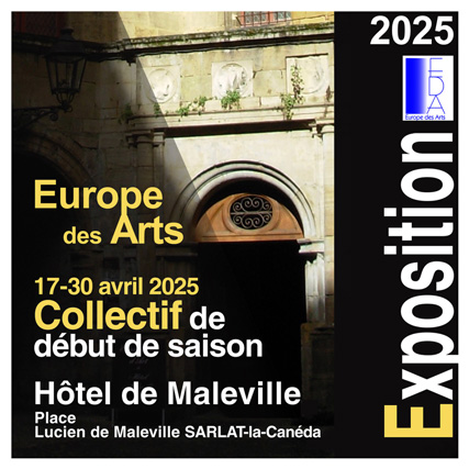 - La première à l'Hotel de Maleville à Sarlat avec le Collectif Europe des Art du 17 au 30 Avril de 9h30 à 18h30. J'y expose pour ma part 5 aquarelles de ma série " Génésis " - La seconde se déroule du 7 au 11 mai à " La Forge " à Souillac, avec là une quinzaine de tableaux toujours de la série " Génésis ".