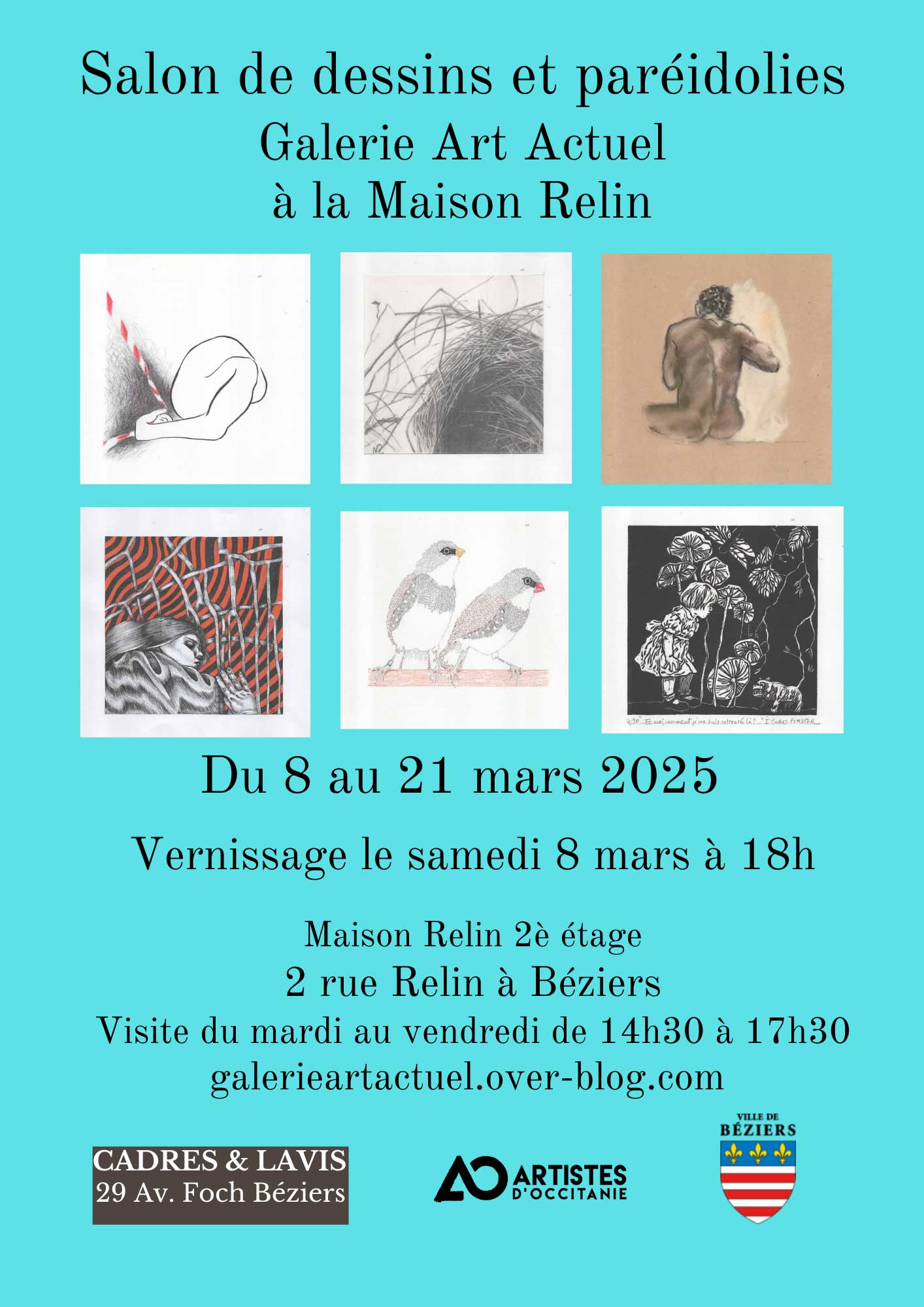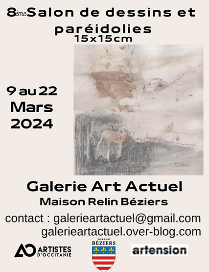 Je participe au "8ème Salon de dessins et paréidolies de Béziers" qui aura lieu du 9 au 22 mars 2024 à la Maison Relin, Béziers. Ci-dessus l'affiche du salon et ci-dessous un de mes travaux présentés (collage d'une encre habilement découpée par mes soins sur papier noir de dimensions 15x15cm). J'aurai en présentation quatre collages dans le même esprit.
