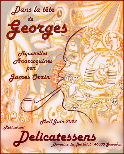 Dans la petite salle, 13 aquarelles sous forme de vignettes monochromes où je me suis amusé à illustrer certains textes de Brassens. Exposition intitulée " Dans la tête de Georges - Aquarelles Anar-Coquines ".