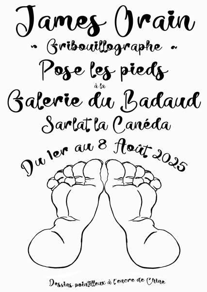 Comme prévu, j'ai le plaisir d'annoncer que je pose mes "Pieds" durant une semaine à la Galerie du Badaud à Sarlat à partir du 1er août et jusqu'au 8 inclus. Horaires de 9h30 à environ 19h selon affluence, entrée libre bien sûr.