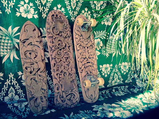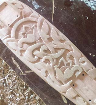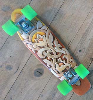 Depuis un an il pratique l'art de la sculpture sur bois (chêne, orme, charme et autres essences) , s'exerçant sur la réalisation de skateboards taillés dans la masse, ainsi que des masques de style ethnique.